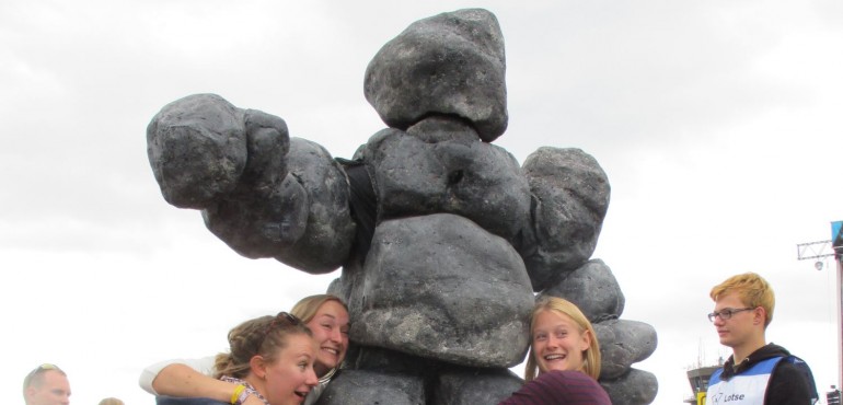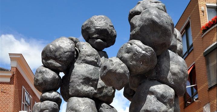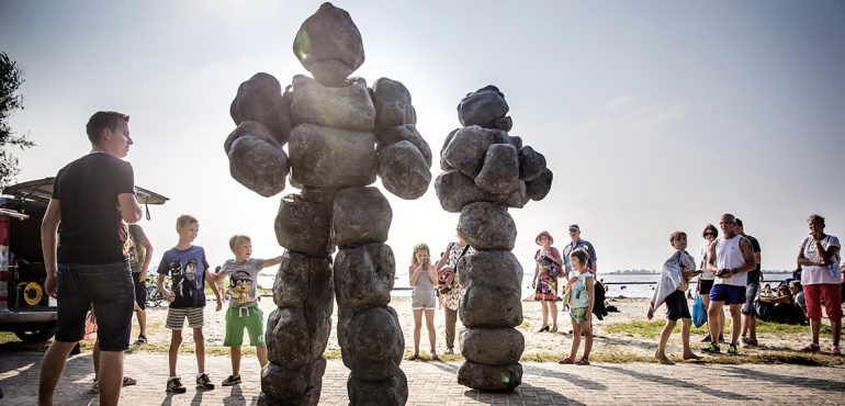 Two imposing rock formations are subtly making contact with the human world. Although they are grand and impressive, the interaction with the audience is playful and friendly. This surreal scene, performed in slow motion, is a unique combination of sculpture and stilt walking-theatre: a fascinating spectacle!