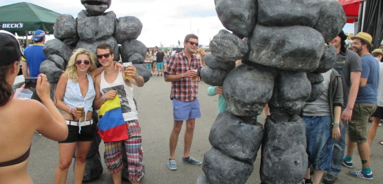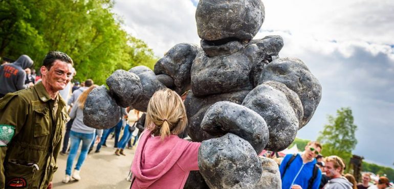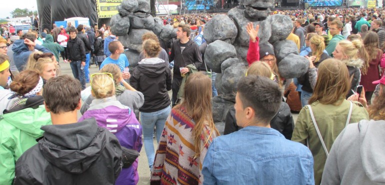 Our players are very experienced and pleasant to work with. Stone-Age is built to last and able to handle a wild atmosphere like no other. Even during changing weather conditions we continue playing! The Stone-Age costumes are waterproof and the type of stilts we use can withstand almost any surface. This makes Stone-Age extremely suitable for pop festivals.